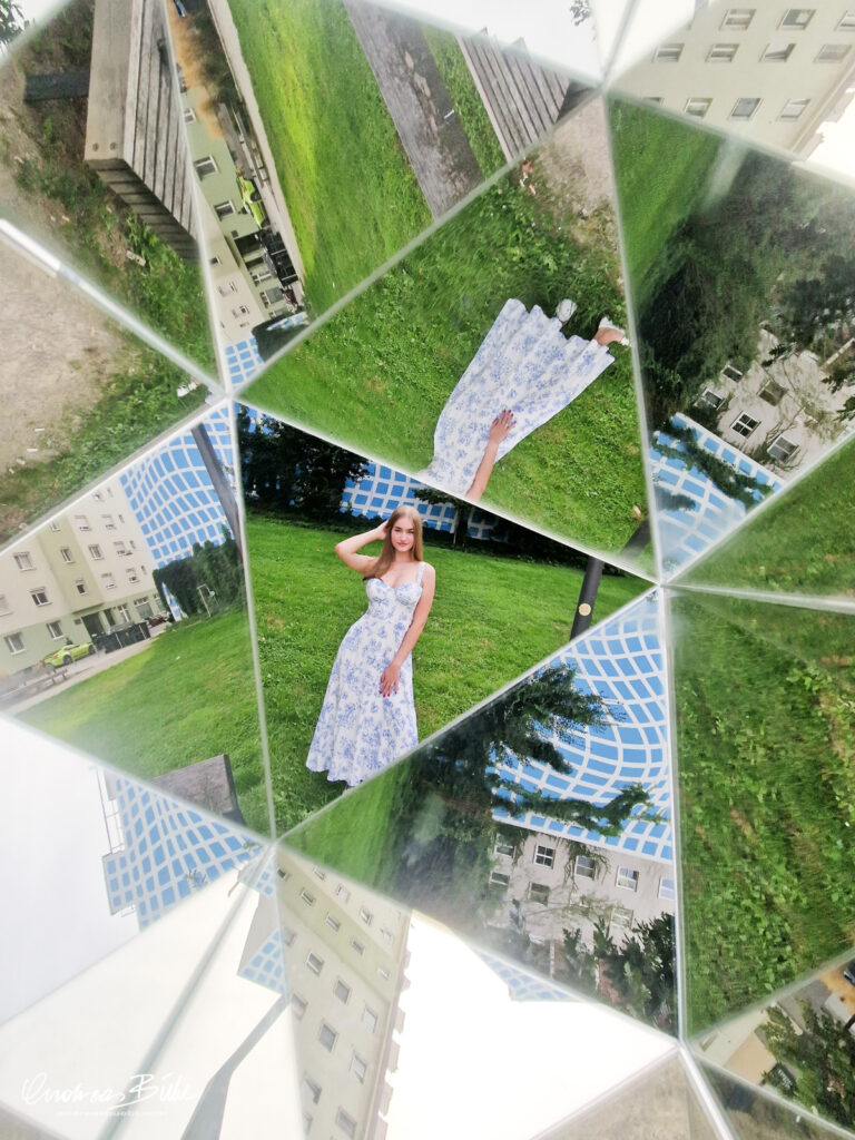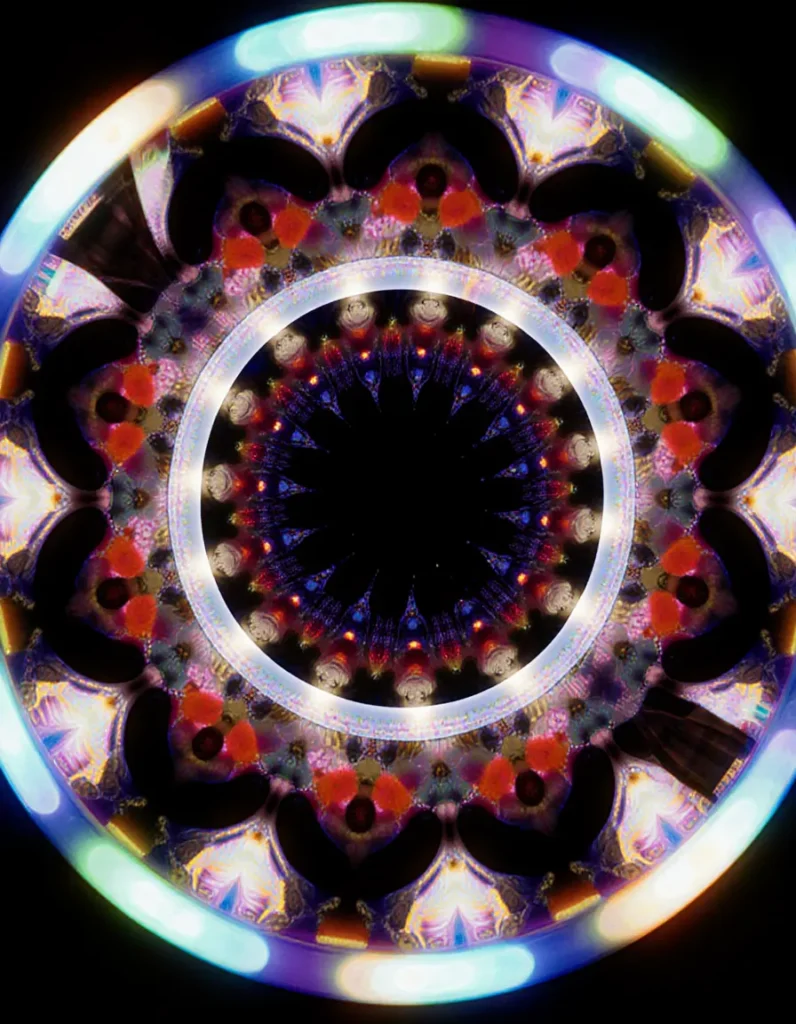 Studio-Shooting mit kaleidoskopischen Elementen: Im Studio fotografieren sie mit kaleidoskopischen Elementen und experimentieren mit Modellen, Objekten und Requisiten, um symmetrische und abstrakte Kompositionen zu erzeugen.